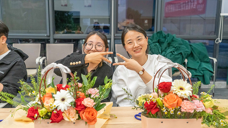 活動現場,花藝老師對插花技巧、花卉的種類習(xi) 性等做了詳細的介紹,同時展示了花枝的修剪方法及造型搭配技巧。經過一番專(zhuan) 業(ye) 的插花知識科普,大家開始躍躍欲試。在花藝老師的指導下,大家根據自己的喜好和風格進行插花體(ti) 驗。小到花卉的分類,大到顏色的搭配,通過邊研究邊創作的形式,盡情發揮著自己的想象力和創造力。